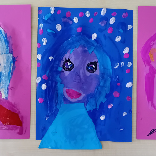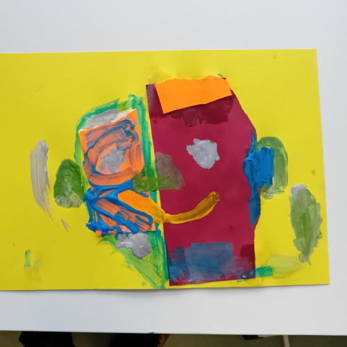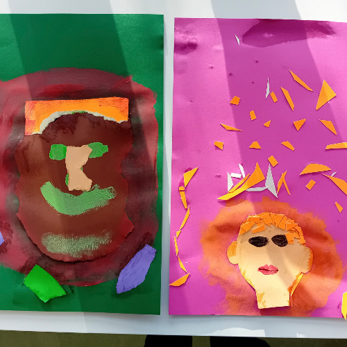 Klieder je eigen zelfportret is een expressieve, speelse les waarin leerlingen een zelfportret maken met behanglijm, verf en gescheurd gekleurd papier. Elk kind werkt met een spiegel en kiest zelf een gekleurde ondergrond. Op een grote “materiaaltafel” ligt alles klaar: verf, lijm, bakjes, snippers papier en eventueel tijdschriften. Ik stimuleer leerlingen om te scheuren in plaats van te knippen. Dat maakt de portretten spontaner, minder bedacht en vaak veel origineler. De kleuren hoeven niet realistisch te zijn — een felgroene neus of paarse oren mogen gewoon. Wel vraag ik ze goed te kijken: hoe ziet een oor er écht uit vanaf de voorkant? Hoe groot is een neusgat? Die combinatie van kijken én vrij werken geeft verrassend sterke resultaten. De behanglijm maakt dit een echte kliederles: verf en papier mogen door elkaar, over elkaar en in lagen. De lijm voelt fijn en tactiel, waardoor kinderen durven te experimenteren. Het proces is belangrijker dan het “mooiste” portret; het gaat om ontdekken, proberen, aanpassen en plezier maken. Dit project werkt voor veel leeftijden en niveau’s. Jongere kinderen kunnen vrij en intuïtief werken; oudere kinderen kunnen juist extra letten op vorm, expressie en compositie. Iedereen gaat naar huis met een kleurrijk, persoonlijk portret — vaak totaal anders dan ze zelf hadden verwacht.