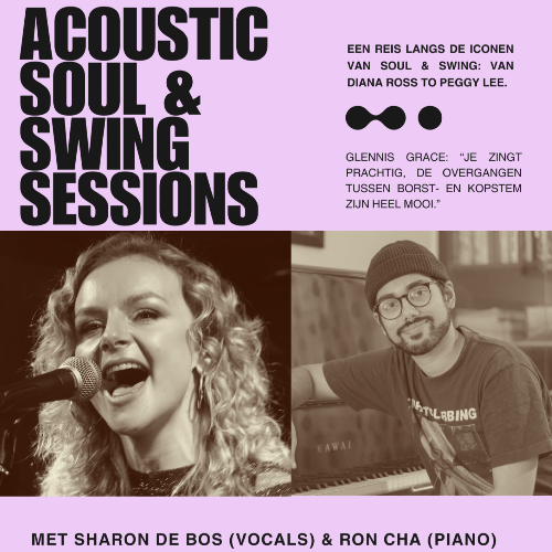 Intiem duo-concert (75–90 minuten) Acoustic Soul & Swing Sessions is een intiem duo-programma van zangeres Sharon de Bos en pianist Ron Cha, waarin soul, swing en subtiele groove samenkomen in een elegante, verstilde setting. Het programma komt het best tot zijn recht in akoestische luistersettings met een aandachtig publiek. Het programma Een concert van 75–90 minuten met stripped-down arrangementen voor zang en piano, waarin storytelling, dynamiek en muzikale verfijning centraal staan. - Storytelling: korte verhalen over de iconen van soul en jazz, hun muzikale nalatenschap en de persoonlijke connectie met deze nummers - Repertoire: klassiekers en enkele nummers eigen werk, van onder andere Diana Ross, Peggy Lee, Ella Fitzgerald, Nat King Cole, Ray Charles, Stevie Wonder & Alicia Keys Over de artiesten Sharon de Bos is een Nederlandse zangeres afkomstig uit Groningen, met een achtergrond in soul, jazz en R&B. Na een artistieke ontwikkeling in Amsterdam en enkele jaren in Madrid — waar zij haar eerste EP opnam met lokale topmuzikanten en deelnam aan televisieprogramma’s waaronder The Voice — keert zij dit voorjaar terug naar Groningen met een nieuw duo-programma. Zij wordt begeleid door Ron Cha, internationaal geprezen pianist en componist, afgestudeerd aan Berklee College of Music. Huidig programma Acoustic Soul & Swing Sessions: Timeless Icons Een muzikale reis langs iconen van soul en swing en hun blijvende invloed, gebracht in een intieme duo-bezetting.