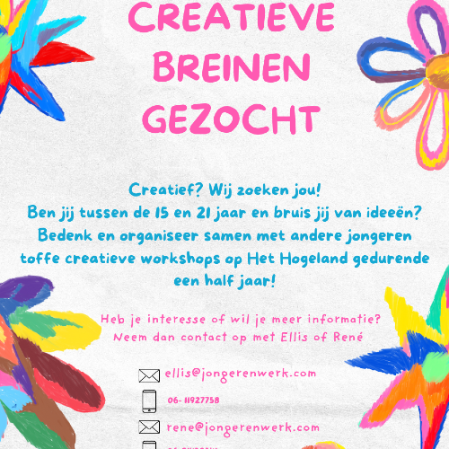 Creatief? Wij zoeken jou! Ben jij tussen de 15 en 21 jaar en bruis jij van ideeën? Bedenk en organiseer samen met andere jongeren toffe creatieve workshops op Het Hogeland gedurende een half jaar! Heb je interesse of wil je meer informatie? Neem dan contact op met: Ellis: ellis@jongerenwerk.com / 06-11927758 René rene@jongerenwerk.com / 06-21452541