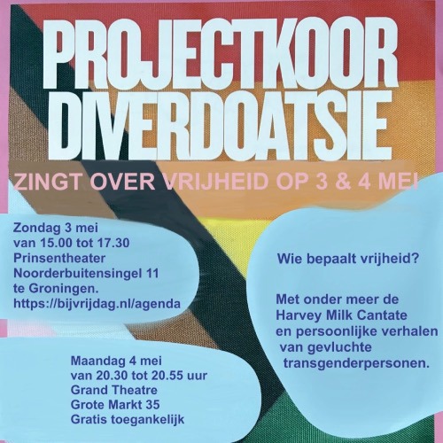 Op 3 en 4 mei presenteert Queerkoor DIVERDOATSIE! uit Groningen het programma 'Wie bepaalt vrijheid?' In het muzikale programma is ruimte gecreëerd voor persoonlijke verhalen van transgenderpersonen die zijn gevlucht uit Rusland en de Verenigde Staten, op zoek naar een plek waar zij wél veilig zichzelf kunnen zijn. Wereldwijd staan vrijheden onder druk. Rijke Amerikaanse christelijk fundamentalistische lobby’s oefenen invloed uit op wetgeving in Europa. Een conservatieve beweging wordt zichtbaar, onder andere in Hongarije onder leiding van Viktor Orbán. Het recente bezoek van J.D. Vance aan Hongarije onderstreept hoe deze ontwikkelingen internationaal met elkaar verbonden raken. Deze tendensen treffen in het bijzonder de LHBTQI+ en vluchtelingrechten. Juist op 4 mei — de dag waarop Nederland de slachtoffers van de strijd om vrijheid herdenkt en wat het betekent om vrijheid te verliezen — stelt het koor de vraag: van wie is vrijheid? Centraal staat de uitvoering Harvey Milk: A Cantata van Jack Curtis Dubowsky over Harvey Milk, destijds vermoord tijdens zijn geweldloze strijd voor rechten van minderheden. Met zang als verbindende kracht brengt het koor een boodschap van ruimte, zachtheid en inclusie. Geen protest, maar een uitnodiging: Maak vrijheid groter. Voor iedereen. Kom luisteren naar alle stemmen en verhalen op zondag 3 mei van 15 tot 17.30 uur in het Prinsentheater aan de Noorderbuitensingel 11 in Groningen (kaartverkoop via VRIJDAG Prinsentheater) en/of alleen de Harvey Milk Cantate op maandagavond 4 mei na de 2 minuten stilte van 20.30 tot 20.50 uur in het Grand Theatre aan de Grote Markt 35 (gratis toegankelijk).Geplaatst op 21 april 2026