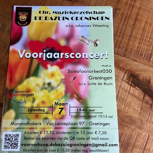 Op zaterdag 7 maart 2026 geeft Christelijk Muziekgezelschap De Bazuin uit Groningen een voorjaarsconcert met medewerking van Saxofoonorkest050 uit Groningen. Het belooft een leuke en gevarieerde avond te worden. U bent van harte uitgenodigd om te komen luisteren. Het concert is in de Maranathakerk aan de Van Lenneplaan 97 in Groningen, aanvang 19.45 uur, zaal open vanaf 19.15 uur. Kaarten € 12,50, kinderen t/m 12 jaar € 7,50, in de voorverkoop te bestellen via voorverkoop.debazuingroningen@gmail.com Kaarten aan de zaal € 13,50 (indien nog beschikbaar).Geplaatst op 12 februari 2026